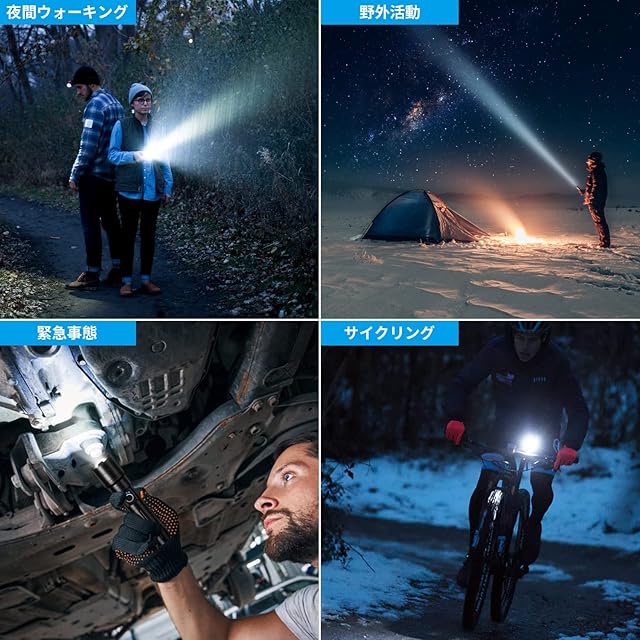 【高性能放熱設計 & 耐衝撃性 & IPX6防水規格 & 防災/防犯多用途】 過酷環境での使用を想定した設計により、耐衝撃性に優れています。高品質のアルミニウム合金表面が陽極酸化処理されており、耐腐食性や摩耗性に強く、より長くご使用いただけます。夜間の移動やウォーキング・花火の時期・夜釣り・キャンプなどのアウトドア・昆虫採集など、様々な場面で便利にご使用頂けます。地震や台風などの災害で万が一停電になったとしてもこのLEDハンディライトがあれば、防犯や避難時に役立ちます。IPX6全密封防護設計で家の中に限らず、庭やテラスでの使用も安心です(水に浸さないでください)。