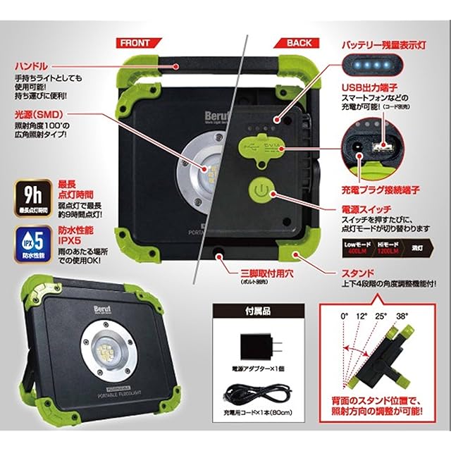 商品名:イチネンアクセス Beruf(ベルーフ) 投光器 ポータブル投光器 充電式 BTKー001R 87225 MAX1200ルーメン
