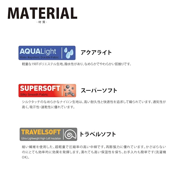 材質/アウター生地 : ポリエステル「Aqualight」インナー生地 : ポリエステル「Supersoft」中綿: ポリエステル「Travelsoft」