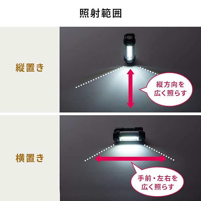 LED部が360度回転でき、点灯位置も自由自在に変更ができるLED作業灯です。縦置き・横置きどちらでも使えます。