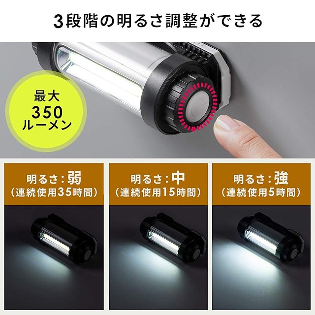 サンワダイレクト LED作業灯【乾電池式】マグネット/フック 防滴IPX4 最大350ルーメン COBチップ 角度調整 800-LED037