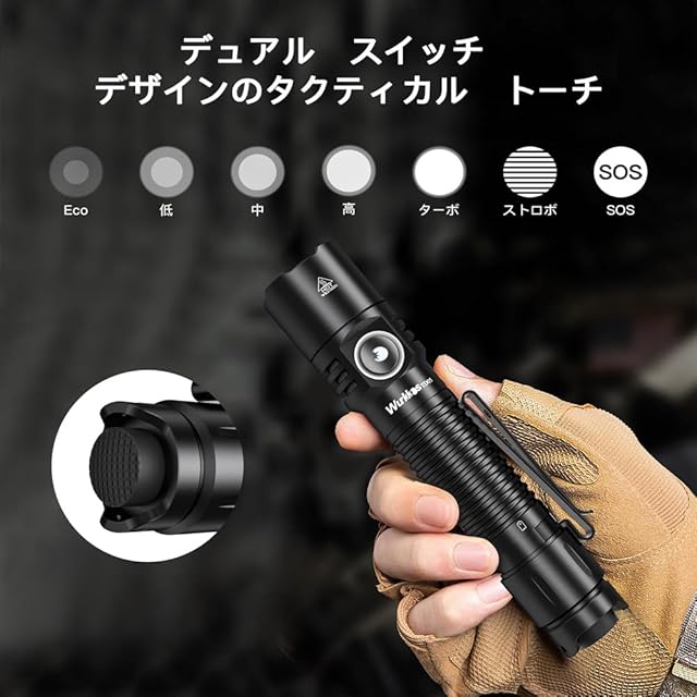 操作説明 <br>TD05懐中電灯は戦術テールスイッチとサイドスイッチで操作し、誰にでも使いやすいです。 <br>懐中電灯がOFFになった時: <br>テールスイッチを軽く押してメモリーモードに入り、テールのスイッチを緩め、メモリーモードをオフ;テールのボタンを押して起動ロックに入ります。 <br>テールスイッチをダブルクリックしてターボモードにし、テールスイッチを押すとフラッシュロックをアクティブにし、クリックすると通常モードを循環させます。 <br>懐中電灯がオンになった時: <br>テールスイッチを押すと、放すと懐中電灯がOFFになり、スイッチのロックを解除します。 <br>サイドスイッチを押して、Eco Low-Medium-Highを循環します。 <br>サイドスイッチをダブルクリックでアクティブターボモードにし、ワンクリックで前のモードに戻ります。 <br>フラッシュモード: <br>高速3回クリックテールスイッチからストロボモードを起動し、三回クリックで循環ストロボSOS;クリックして前のモードに戻り、ダブルクリックしてターボモードに入ります。 <br><br>