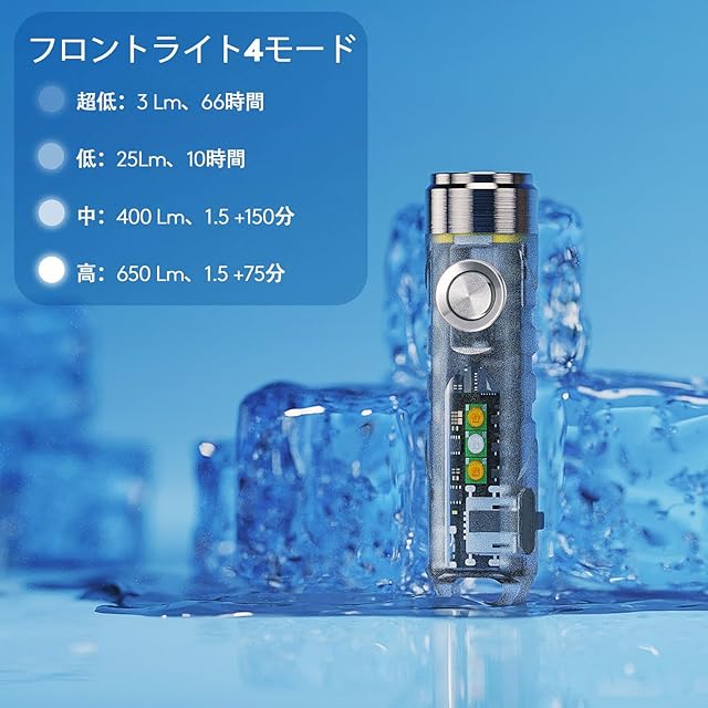 【ワンクリックで片手操作】高ルーメンの懐中電灯は、誤操作を防ぐサイドスイッチを採用し、バッテリーの消耗を心配しません。 片手で物を持っているときに片手での操作に便利です。 長押しするとモメンタリモードがオンになります。また、環境に応じて最適なモードを選択できます。 (ダブルクリック:Moonlight: 3 Lm-66時間です、LOW: 25 Lm-10時間です、MED:400 Lm、1.5+150分、HIGH:650 Lm、1.7+75分、STROBE)