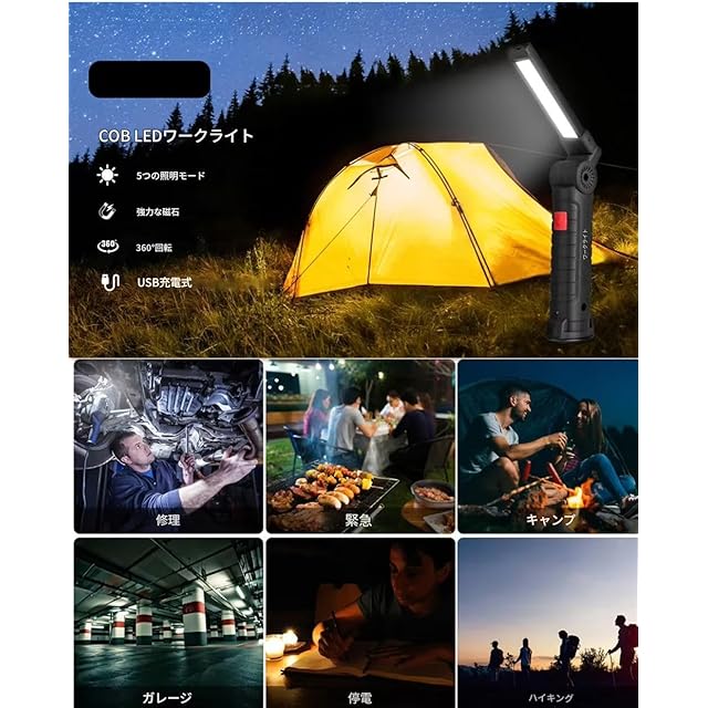 商品名:zmart COB LED ランプ USB 充電式 バッテリー LED ライト マグネット ポータブル 懐中電灯 屋外 キャンプ トーチ 作業灯 チップオンボード LED照明 基板 集光 投光器 高輝度 省エネ 電球色 昼光色 放熱ヒートシンク SMD パワー パネル 拡散光 フラッドライト