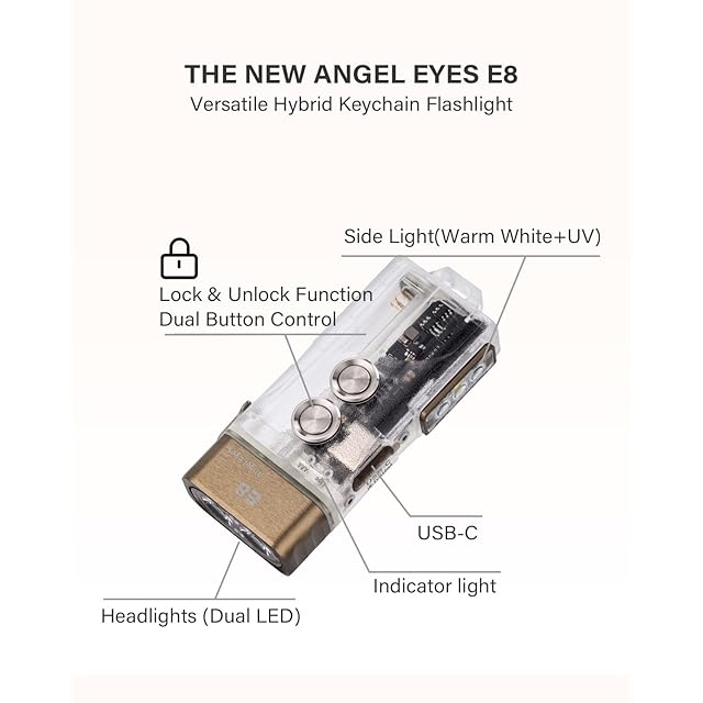 E8 多機能懐中電灯 365nm UV LED は紙幣を照らすことができます <br>デュアルバッテリー ハイブリッド バッテリー システムを使用し、内蔵の 330mAh リチウムイオン バッテリーまたは AAA を搭載E8 は単 4 電池を使用して。<br>ヘッドライトは90+高演色4000Kダブルランプビーズで、Eシリーズフラッシュライトをベースにサイドライト(白色光モード+UVモード)を追加しました。 <br>コンパクトサイズ、軽量ボディで日常からアウトドアまで活躍します。 EDC愛好家により実用的で創造的な懐中電灯を提供することに尽力しています。<br>4000K ウォーム ホワイト 95 CRI LED <br>補助エミッタ: ウォーム ホワイト/UV<br>防水: IPX6 <br>寸法: 66.1 mm /2.6"(L)*27.5mm/1.08"(W)*13.5mm/0.53"(H) 重量: 41g <br>付属品: 取扱説明書*1、キーリング(Lサイズ)*1。キーホルダーリング(Sサイズ)×1、ポケットクリップ×1、書×1<br><br>操作<br>ボタン1(フロントLED用) <br>1.ロック: オフから 4 回以上クリックすると、青色のライトが 3 秒間点滅します。<br>2.ロック解除:ロックモードからすばやく 4 回以上タップすると、緑色のライトが 2 秒間点滅します。<br>3. Moonlight: クリックして閉じ、もう一度クリックして閉じます <br>4.瞬時にオン: 押して離すとオフ <br>5.メモリ モードをオンにします。すばやくダブルクリックしてから、クリックして低輝度 - 中速 - 高輝度 - ハイライトを繰り返します <br>6.電源オフ: 0.5 秒間長押し <br>7.ストロボ: オフまたはヘッドライトの動作 (ムーンライト モードを除く) から 3 回クリックしてから、1 回クリックしてオフにします。 <br><br>ボタン 2 (サイド補助 LED 用) <br>1.クローズから、クリックして白い低モードから開き、次にクリックして低から高のサイクルにし、0.5 秒間長押しして閉じます。 <br>2.オフまたはサイドライトオンから、すばやくダブルクリックして UV モードをオンにし、0.5 秒押してオフにします。 <br>オフまたはサイドライトオンから、すばやくダブルクリックしてUVモードをオンにし、0.5秒押してオフにします。 <br>*シャットダウンは、最後に使用されたモードを記憶します。 <br>**このボタンは、別のボタンが使用中の場合は機能しません。