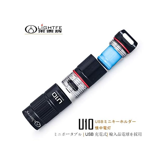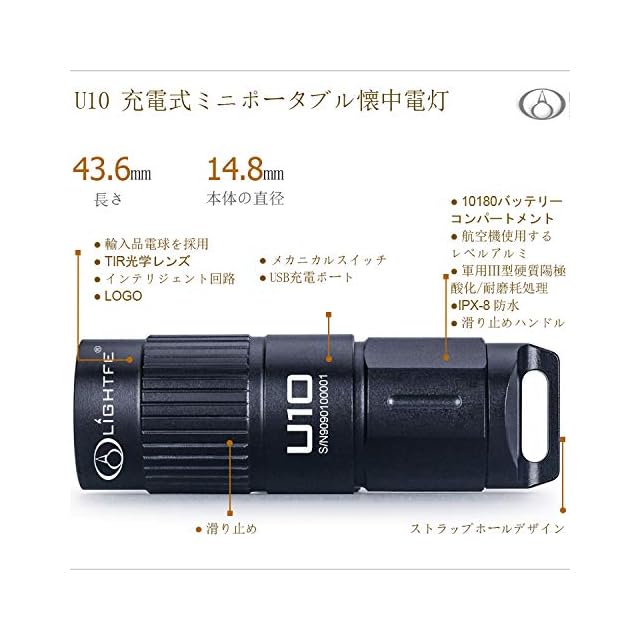 U10 USB充電式ミニポータブル懐中電灯 USB充電式<br> <br>ブランド名:LIGHTFE U10 <br> <br>電球を使用:CREE XM L2 <br> <br>明るさ:80LM <br> <br>射程:50メートル <br> <br>本体の材質:航空機使用するレベルアルミ <br> <br>表面処理:軍用Ⅲ型硬質陽極酸化/耐磨耗処理 <br> <br>製品サイズ:長さ46.3mm *本体直径:14.8mm <br> <br>製品重量:11g(電池は含まない) <br> <br>対応電池:1*10180リチウム電池(含む) <br> <br>点灯時間:1H( high モード ) <br> <br>機能:USB充電式、充電インジケータ、ロータリーメカニカルスイッチ、ミニポータブル <br> <br>防水レベル:IPX-8防水 <br> <br>入力電圧:3V-4.2V <br> <br>製品の色:黒 <br> <br>レンズ:TIR光学ガラス <br> <br>様々な使う場合:小型なので携帯性に優れた、夜釣り、登山、キャンプ、アウトドア、夜道の一人歩き、防犯、防災、地震対策、停電時などの必需品としてお勧めです。<br> <br>商品詳細<br> <br>*光を良く通す強化ガラス製レンズと高精密アルミニウム合金製反射ソケットを使用しています。光の透過率≧99%、集光能力が強化されています。<br> <br>*智能チップ、デジタル定電流出力、明るさが安定、目眩スプラッシュはしません。<br> <br>*航空機使用するレベルアルミで加工され、どんな角度でも高さ1.5mからの落下を耐えます。表面は軍用Ⅲ級硬質陽極酸化処理で、防刃、耐摩耗、耐腐食など特徴があります。<br> <br>*インテリジェンス温度制御で、懐中電灯の過電流・過熱を防ぎます。電池の正負極を防逆入れの安全保護設計され、電池を逆に入れた後により懐中電灯の部品への損傷を、有効に避けます。<br> <br>*電池の正負極を防逆入れの安全保護設計で、電池を逆に入れた後により懐中電灯の部品への損傷を、有効に避けます。<br> <br>*シリコン製O型ネジ山密封IPX-8高レベル防水設計を採用され、雨や水を有効に抵抗できます。<br> <br>*構造はコンパクトで、携帯にとても便利の上、操作も簡単です。效率が高い、専門的、先進的な照明装備<br> <br>*智能温度管理システム、過負荷、オーバーチャージ過放電保護、電池逆方向入れ防止設計により、逆さまに入れた時に生じた危害を防止します。<br> <br>*構造は科学的に、作りは卓越で、品質も信頼できます。<br> <br>*本製品は信頼できる品質、且つ優れた耐久性がある上に、アフターサービスと品質が付いております。<br>