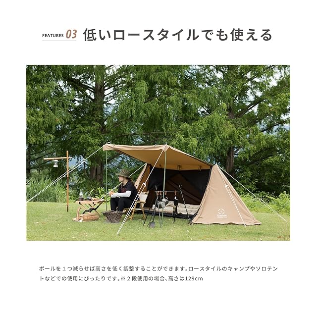 【低いロースタイルでも使える】 ポールを一つ減らせば高さを低く調整することができます。 ロースタイルのキャンプやソロテントなどでの使用にピッタリです。 ※2段仕様の場合、高さは129cm