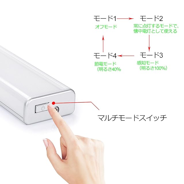 【四つのモード】1、オフモード 2、常に点灯するモード、懐中電灯としても使えます 3、感知モード(明るさ100%) 4、節電モード(明るさ40%) 周囲環境の照度が<3LUXであり、3m以内に人の動きを感知すると、自動に点灯し、20s内に動きがなければ自動に消灯します。四つのモードが違う要求に満足できます。