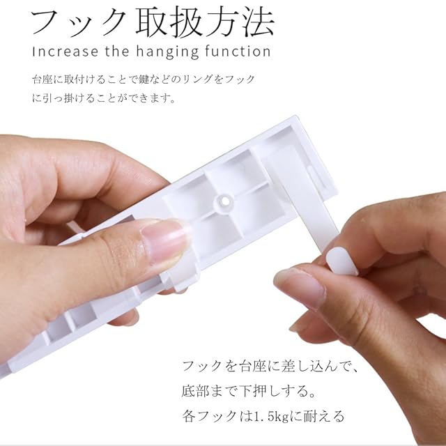 【フック付きで、小物収納】フック付きのLEDセンサーライト!フックが4個付属しており、台座に取付けることで鍵などのリングをフックに引っ掛けることができます。黒くて鍵が見えにくい場所でもライトが自動的に点灯するので、いちいち電気をつけなくても鍵などを取ることができます。