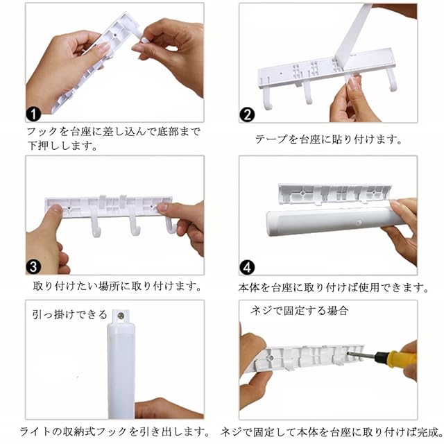 【3Mテープで設置簡単】電源・配線など一切無し、3Mテープと掛け用フックで、どこでも簡単に取り付けます。クロゼット、タンス、本棚、押し入れなどのような場所にも適合です。ライトの本体を台座に取り付けたり、または「ON」モードで取り外したりして手持ちの懐中電灯としても使えます。またおまけのネジがあり、玄関先等の壁面にも簡易に設置できます。