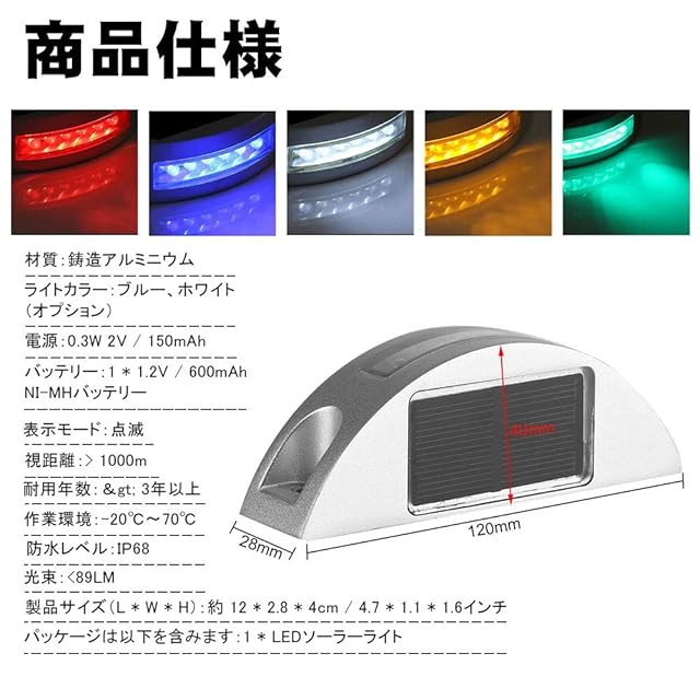 [高視認性設計] 路面表示灯として夜間や悪天候時に優れた視認性を発揮。トンネル内や曲線部、交差点での事故防止に貢献します。IP68防水仕様で屋外の厳しい環境にも耐え、駐車場や歩道などさまざまな場所で安心して使用可能。