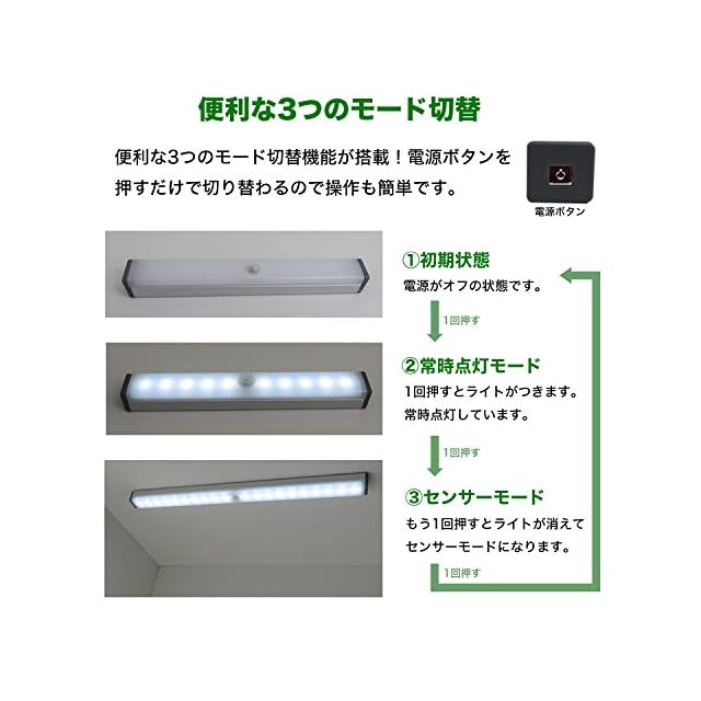 「ボタン一つでお手軽操作」:1回スイッチボタンを押せば点灯、2回押すとセンサーモード、3回押すと消灯します。また、3秒長押しすれば明るさを調節できます。6秒間長押しすると、ランダムに点灯と消灯を繰り返すSOSモードとなります。「取付簡単マグネット内蔵」:お取り付けはマグネット内蔵のため金属にはそのまま引っ付きます。金属以外には付属の両面テープ付マグネットを貼り付けて使用ください。