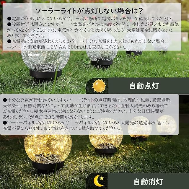 【ソーラーライトが点灯しない場合は?】●電源が「ON」に入つているか?。 →暗い場所で電源ボタンを押して確認してください。●設置付近は明るいですか? →太陽光パネルの感度がすぎて、少し光が見えまでも電気がつかなくなってしまった、電気がつかなくなる状況があったら、大空は完全に暗くなったあと試してください。●充電池の寿命が終わりましたか? →十分な充電をしたあとでも点灯しない場合、ニッケル水素充電池 1.2V AA 600mAhを交換してください。●十分な充電が行われていますか? →(ライトの点灯時間は、地理的な位置、設置場所、天候条件、日照時間などによって変動が生じます。)できるだけ直射太陽光のある場所でご充電ください。●ソーラーパネルが汚れているか? →パネルが汚れていると太陽光の透過率が低下し、充電不足になります。布で汚れをきれいに拭き取つてください。