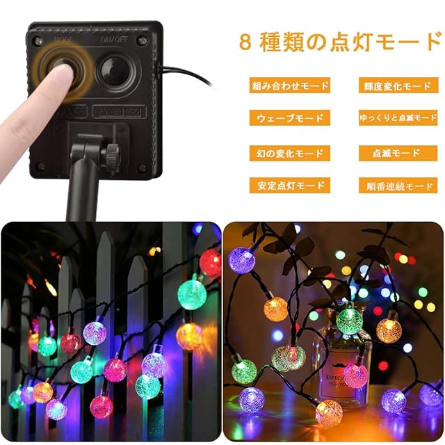 8つの点灯モード:ストリングライトの「Mode」ボタンを押して、合計8点灯モードが簡単に交換できます。8種類の点灯モデルで、パーティー、祝日に暖かい雰囲気を作ることができます。