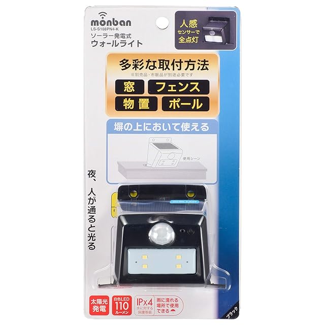 オーム電機 センサーウォールライト(110lm/ソーラー充電式/白色LED/ブラック) LS-S108PN4-K