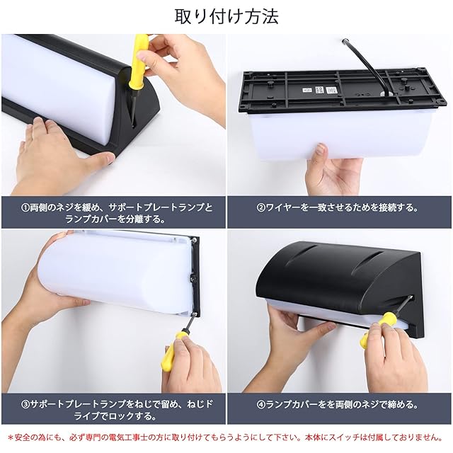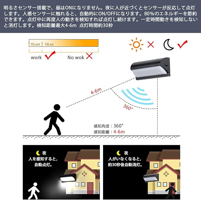【人感 明るさセンサー内蔵】壁面取付ポーチライトは昼間はオンになりません。周囲が暗くなると(10 - 20ルクス以下、日没直後の室内程度の暗さ)、人が近づくとセンサーが反応して点灯します。人感センサーに触れると、自動的にON/OFFになります。80%のエネルギーを節約できます。点灯中に再度人の動きを検知すれば点灯し続けます。一定時間動きを検知しないと消灯します。検知距離MAX4-6m、点灯時間約20~30秒 センサーに直射日光が当たらないようにしてください。エアコン室外機、換気扇、ボイラーなどの熱風が当たると人感センサーが誤検知する場合があります。感知範囲以内の野良猫と自動車が通って点灯可能性もがあります。(ご注意:センサーの反応距離と点灯時間は固定です。変更はできません。周囲温度22℃の時にセンサー真正面を横切る動作をする場合、検知距離はセンサーとの角度、動く方向、周囲の温度で短くなります。対応温度範囲:-10 - 40℃)