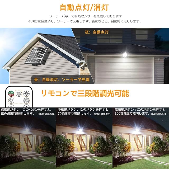 【高感度センサー付き、自動点灯/消灯】120°広い感知角度と8-10m感知距離の高感度センサーが搭載されています。センサーライトは人や動物などの熱を感知して自動的に点灯します。30秒経過した後に自動消灯します。手間がかからずとても便利です。暗い夜に帰ると明るい照明がお出迎え、防犯対策にも最適です。【2700K~6500K調色可能】リモコンで色温度を2700K~6500K調整できます。市場よくある単色のソーラーライトと違い、電球色と昼光色と昼白色三色を切替可能です。電球色が欲しい、でも昼白色も捨てがたい、或いはやや暖色ぽいの昼光色の方がいい、自分の場合によって色を変換できます。