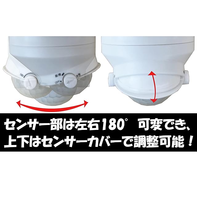 ●点灯時間設定:常時点灯、約10秒~約5分 ●センサー部可動角度:約180度(左右約90度)