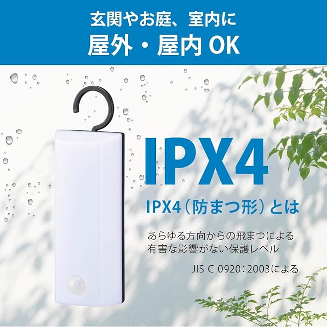 【 特 長 】 ◆屋外でも使える(IPX4)、フック型明暗+人感センサーライト ◆周囲が暗くなると人を検知して点灯、離れてしばらくすると自動消灯 ◆乾電池式(単3形乾電池×6本使用)で配線不要。電源のとれない場所や配線ができない場所におすすめ ◆常時点灯モード付き ◆光色は昼白色、明るさ200ルーメン