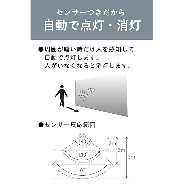 【検知方式】 : 焦電型赤外線センサー ( PIRセンサー) 【検知距離】 : 8m 140°