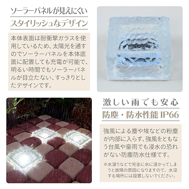 【商品スペック】本体サイズ:8×8×5.3cm / 本体重量:300g / 材質:ガラス、ポリスチレン / 光色:ホワイト / 防塵防水性能:IP66 / 明るさの目安:0.06W相当 LED1灯 / ルーメン値:約1.34㏐
