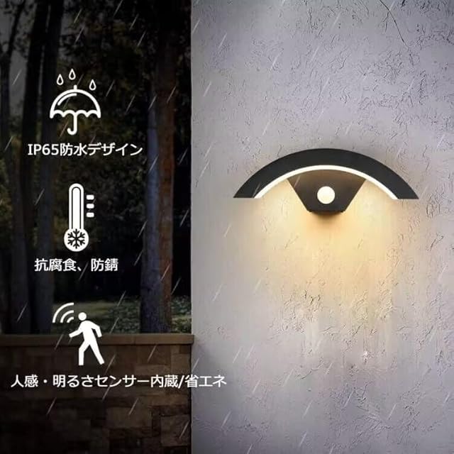 【人感・明るさセンサー内蔵/省エネ】壁面取付ポーチライトは昼間はオンになりません。人が近づくとセンサーが反応して点灯します。人感センサーに触れると、自動的にON/OFFになります。80%のエネルギーを節約できます。点灯中に再度人の動きを検知すれば点灯し続けます。一定時間動きを検知しないと消灯します。検知距離最大8m、点灯時間:20秒~30秒