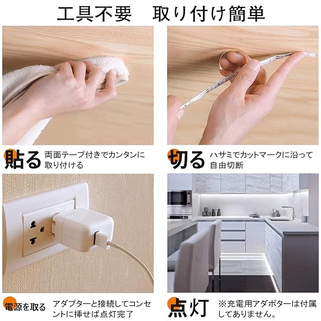【取り付け簡単・省エネ】 消費電力がわずか6Wで一般照明より省エネ。発熱量も少なく環境に優しい。更に、USB給電式なので、電池が不要で、頻繁に電池交換の手間と電池を買う金が省けます。また、優れた柔軟性が持ちので、自由に曲がれてお好きな形を調整可能です。取り付けやすいし、手軽に固定することができます。簡単に取り外すことができ、家具を傷めたり、痕がつかなく壊すことはありません。賃貸の方にもお勧めします。「ご注意:切断したら、残った部分は再利用することができません。」