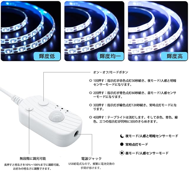 【人感モード】このモードは人とペット動きを感知すると自動で点灯します。設置すると夜起きると、足元は柔らかい光を出します。夜間使用に最適な柔らかな光は目の視力をよく保護します。深夜でトイレなどに行く時に大便利です。*安心:購入後もし調光器が接触不良あるいはテープライト破損などの問題があれば、弊社にご連絡ください。お客様のご質問を解決するために最善を尽くします。