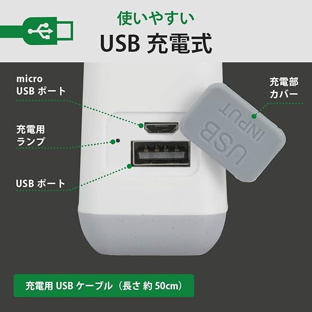 ≪ご注意≫※ 充電機器用のUSBケーブルは本製品には含まれておりません。※ パソコンのUSB端子からの充電はしないでください。※ 充電しながらの点灯は絶対に行わないでください。※ 他機器への給電をしながらの本体充電・点灯は絶対に行わないでください。