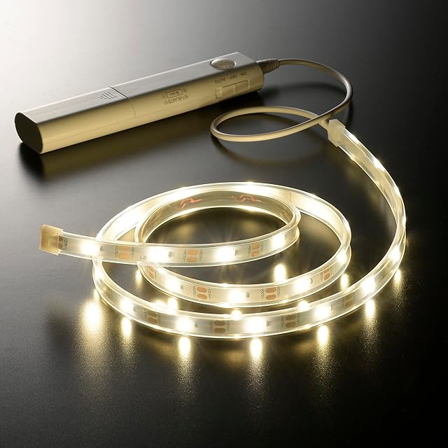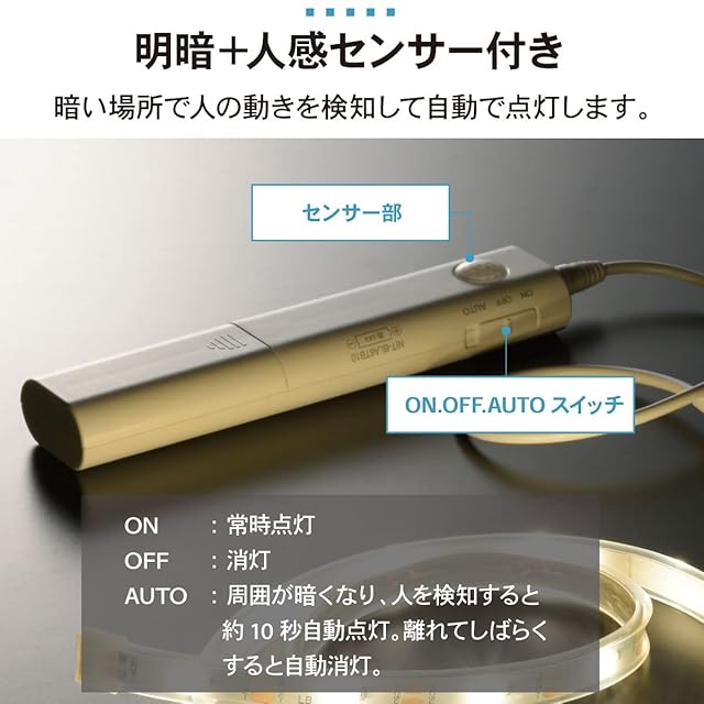 【 特 長 】 ◆お好みの長さにカットしてご使用できます。 ◆付属の両面テープまたはマグネットテープで設置します。 ◆暗い場所で人の動きを検知して自動で点灯します。 ◆乾電池式で電源の取れない場所でも使用できます。 ◆ON(常時点灯)/OFF(消灯)/AUTO(センサー)切換スイッチ付き ◆テープライト長さ1m ◆点灯色は白色