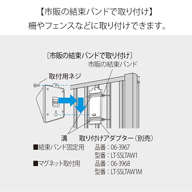 ◆取り付けアダプター(別売): 結束バンド固定用…品番 06-3967、型番 LT-SSLTAW1 マグネット取付用…品番 06-3968、型番 LT-SSLTAW1M≪ご注意≫※ ご購入時は充電が不十分です。※ 電源をOFFの状態で晴天の日に、約2日間充電した後にご使用ください。(電源をONの状態では夜間点灯する事により、充電残量が減り、フル充電できません)※ 初期充電完了後は本体背面部の電源スイッチを常時ONにしてご使用ください。