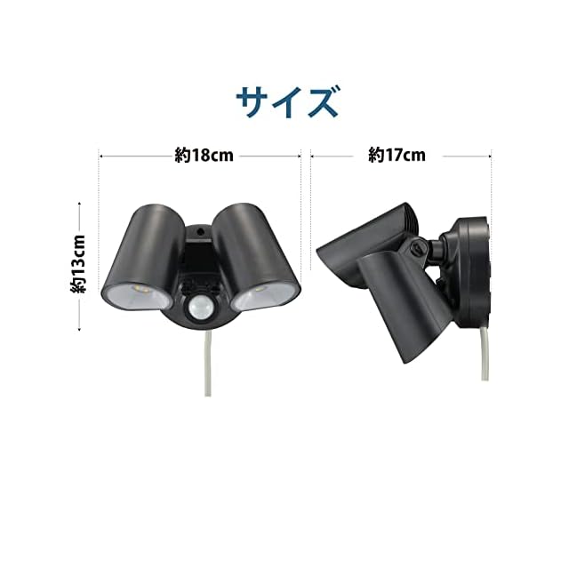 【 仕 様 】 ◆外形寸法:(約)幅180×高さ130×奥行170mm(本体のみ) ◆質量:約750g(電源コード含む) ◆光源:昼光色LED ◆全光束:2000 lm ◆電源:100V 50/60Hz ◆消費電力:20W 1.0W以下(待機時) ◆エネルギー消費効率:100 lm/W ◆電源コード長:約3m ◆センサー:検知方式…焦電型赤外線センサー、検知範囲…最大約120°最長約7m(取り付け高さ約2mの場合) ◆周囲の明るさに対応:昼(明るい時でも点灯)/夜(暗い時に点灯)