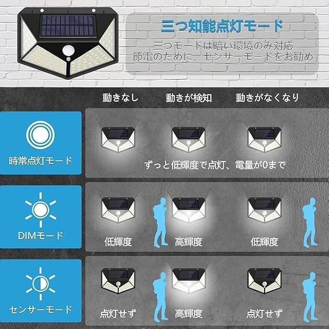 【3つの知能モード】ledソーラーライトには3つのインテリジェントモードがあります:常時点灯モード、DIMモード、センサモード。用途によってモードを選択できます。【常時点灯モード】昼間や明るい場所では消灯します。夜や暗くなると、自動的に弱い光で点灯しています。【DIMモード】夜や暗くなると、自動的に弱光点灯します。人や動物の動きを感知すると、自動的に高輝度点灯になって、動きがなくなると約15秒後弱い光で点灯状態に戻ります。【センサーモード】夜や暗くなるんと、人や動物の動きが検出されると自動的に高輝度照明に切り替わり、約15秒後に何の動きもなく自動的にオフになります。