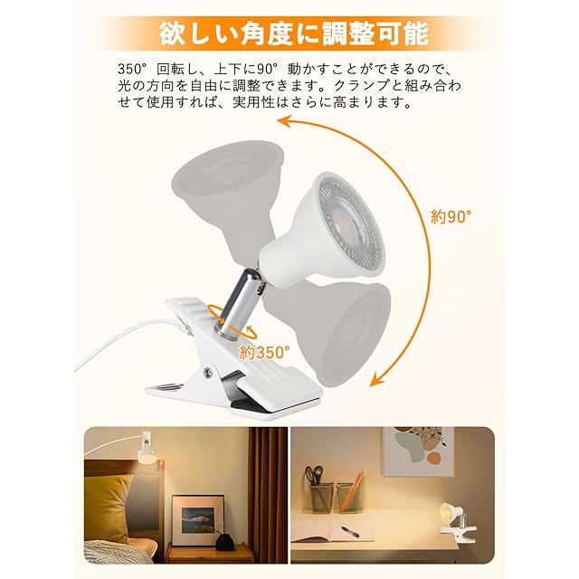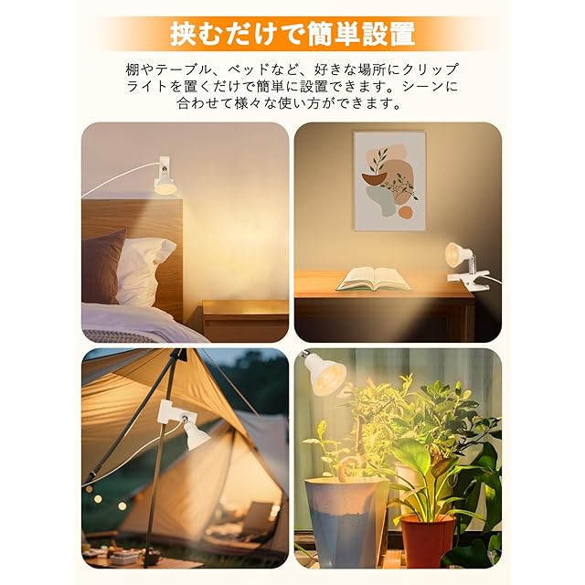 【2024年10月全光束アップグレード・仕様】全光束:1200lm、消費電力:9W、本体サイズ:高さ14.5cm×幅6cm×奥行9.8cm、ヘッド :直径6cm×奥行8.5cm ,アーム:60mm,推奨クリップくわえ約2cm~2.5cm,※最大で3.5cm程度まで開きますが、かかりしろが少なくなります。推奨範囲外でのご利用はおやめください。コード長約:3.0m、総重量:約500g(含コード)。LED仕様:電球色、電圧:AC100V、 平均演色評価数 : Ra83、照射角度:約60度。約50000時間の長寿命に使用できます。