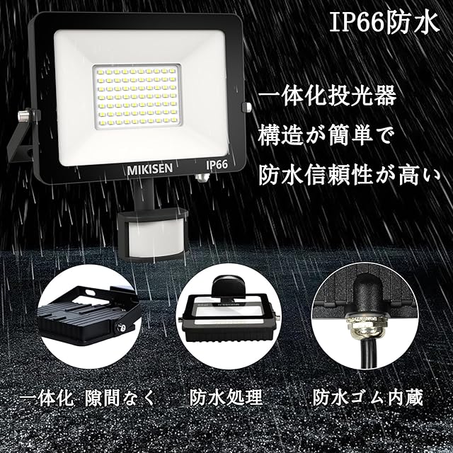 【調光機能付き】mikisenのセンサーライトは10段階調光(調整範囲1~50w)の機能を持っており、5w/10w/20w/30w/50wのセンサーライト/投光器として使用することができます。【常時点灯機能付き】常時点灯を設置することもできて、特に倉庫の入り口で使用することに適して、作業がない場合はセンサーモードを使用して、作業(荷物等の運搬作業)が必要な時は常時点灯モードを調整することができます。【検出距離を調整可能】検出距離を調整することもできて、最大検出距離は10 mで、最小検出距離は6 mぐらいです。【点灯照度调整】DAYモードは24時間動作し、NIGHTモードは夜間でしか反応しません。【タイマー機能付き】今から1時間/3時間後に常時点灯モードを停止する、その後センサーライトモードで動作します。