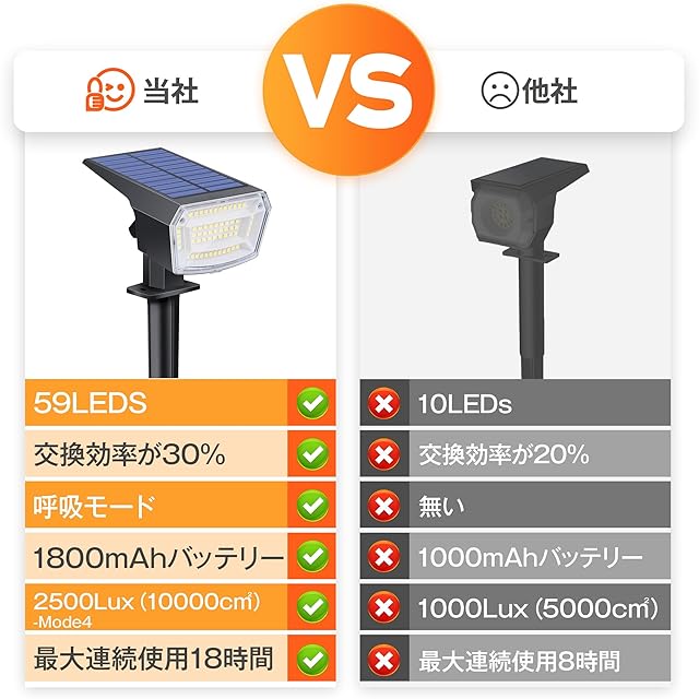 ソーラーライト 屋外 明暗センサー ガーデンライト スポットライト 庭 ライト おしゃれ 屋外 照明 IP66防水 1800mAH 59LEDs 電球色 防犯防災 庭園灯 芝生 歩道 車道 駐車場 玄関 2個セット