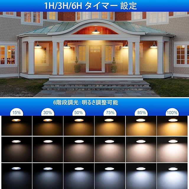 【2つの照明モード&3階段調色&6階段調光】AGOTDのソーラーセンサーライトは「常亮」と「AUTO」モードがあります。「常亮」モードを利用すると、光センサーは無効になり、リモコンで制御します。「AUTO」モードを利用する場合、光センサーは有効になり、周りが暗くなったら作動します。また照明色を電球色/白色/昼光色に切り替えることができます。ランプの輝度も6段階調整できます。