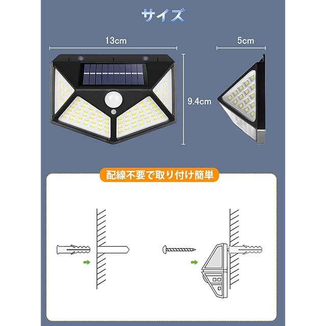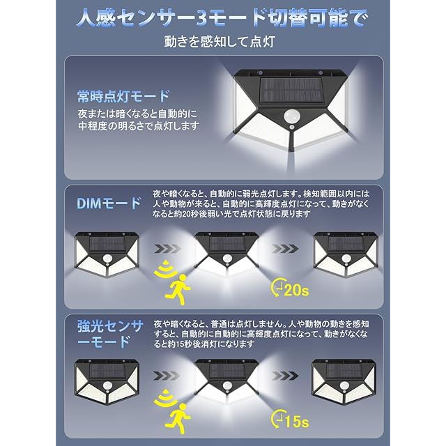 【3つの知能モード】ledソーラーライトには3つのインテリジェントモードがあります:常時点灯モード、DIMモード、センサモード。用途によってモードを選択できます。【常時点灯モード】昼間や明るい場所では消灯します。夜や暗くなると、自動的に弱い光で点灯しています。【DIMモード】夜や暗くなると、自動的に弱光点灯します。人や動物の動きを感知すると、自動的に高輝度点灯になって、動きがなくなると約15秒後弱い光で点灯状態に戻ります。【センサーモード】夜や暗くなるんと、人や動物の動きが検出されると自動的に高輝度照明に切り替わり、約15秒後に何の動きもなく自動的にオフになります。