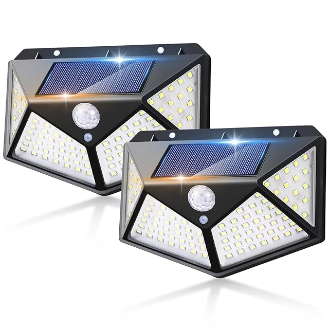 「2025新版高輝度」ソーラーライト 人感センサー【270°広角照明・4面発光・3つ知能モード・自動点灯】太陽光発電 電気代0 IP65防水防塵 100LED 設置簡単 電池交換不要 玄関/廊下/庭/壁掛け/駐車場/物置/停電時適用 防犯 地震 津波 台風 防災対応 (2個セット)