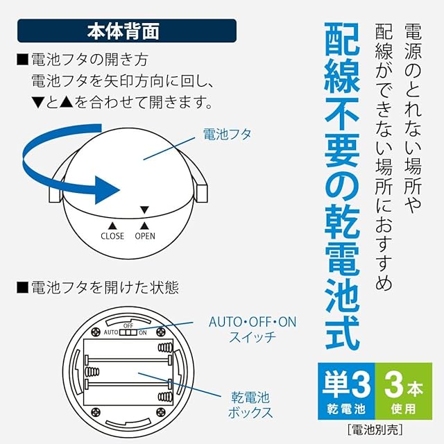 【乾電池取り換え目安】電源は単3形乾電池×3本(乾電池別売)を使用。目安として、AUTOモードで1日10回点灯させた場合、約7か月使えます。ONモードで、連続点灯した場合約20時間点灯が可能です。