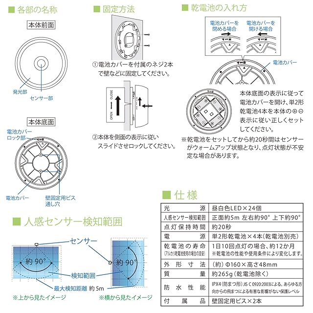 人感センサー検知範囲:正面約5m 左右約90° 上下約90°