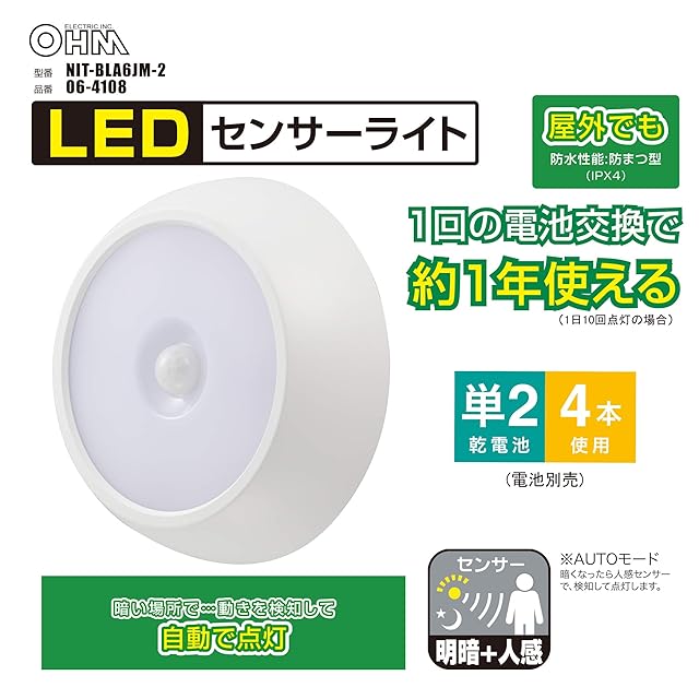 商品名:オーム電機 LEDセンサーライト 明暗+人感 屋内/屋外兼用 NIT-BLA6JM-2 06-4108 OHM
