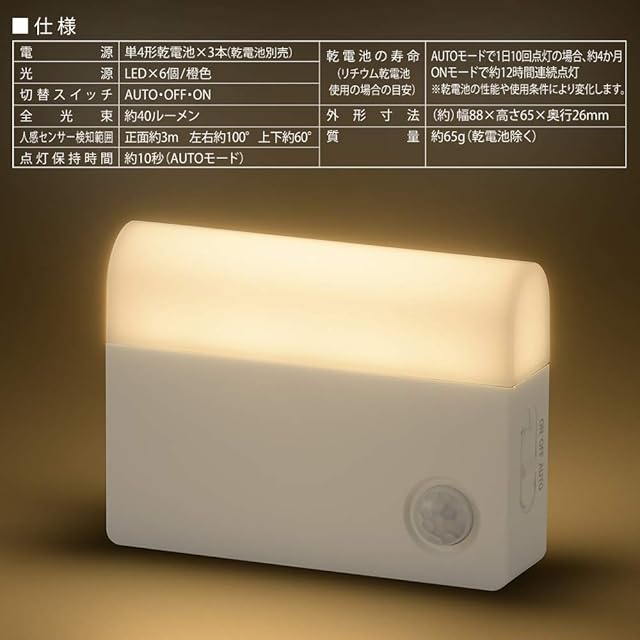 商品名:オーム電機 LEDセンサーライト 明暗+人感 屋内用 電池式 NIT-BLA6JK-WL 06-0143 OHM
