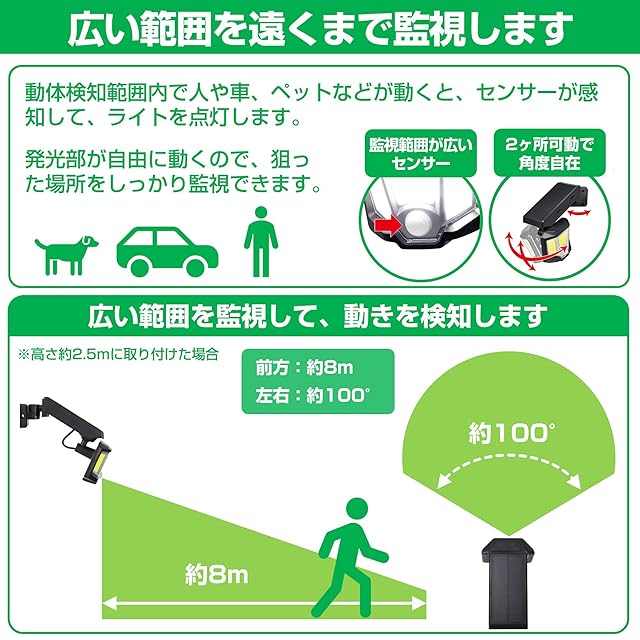 【大雨にも強い】暗闇でセンサーが人や車の動きを検知して自動点灯 します。最大8m先、左右約100°を検知します。屋外に設置できる防水仕様(IP65 防噴流形)です。