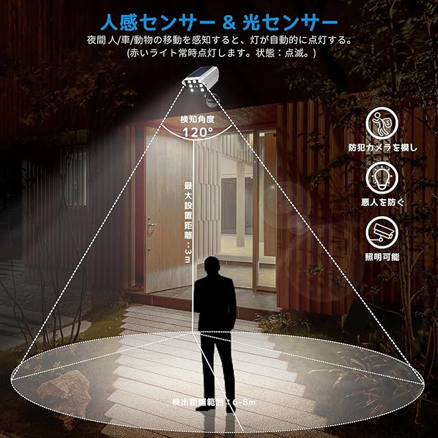 「3つの点灯モード 」この 防犯センサーライト 屋外 ソーラー 人感 はPIR人体センサーと光センサーを搭載している。♥(1)人感センサー & 低輝度 モード:夜間灯が自動的に点灯、低輝度, 人が感応範囲内を通過すると、明かりが明るくなります, 人が20秒離れると灯の明るさが自動的に暗くなる、低輝度。♥(2)人感センサー モード(赤いLEDモード):夜間は明かりがつかない,人が感知範囲内を通過すると、灯が自動的に点灯する,人が離れて20秒後に自動的に消灯。(赤いLEDが常時点灯します。状態:点滅。)♥(3)通常点灯モード:夜間灯が自動的に点灯し,4時間の作業後、灯は自動的に低輝度になる。具体的な操作:電源ボタンを長押しして電源オンとオフを操作し、電源ボタンを短押ししてモードを切り替える。