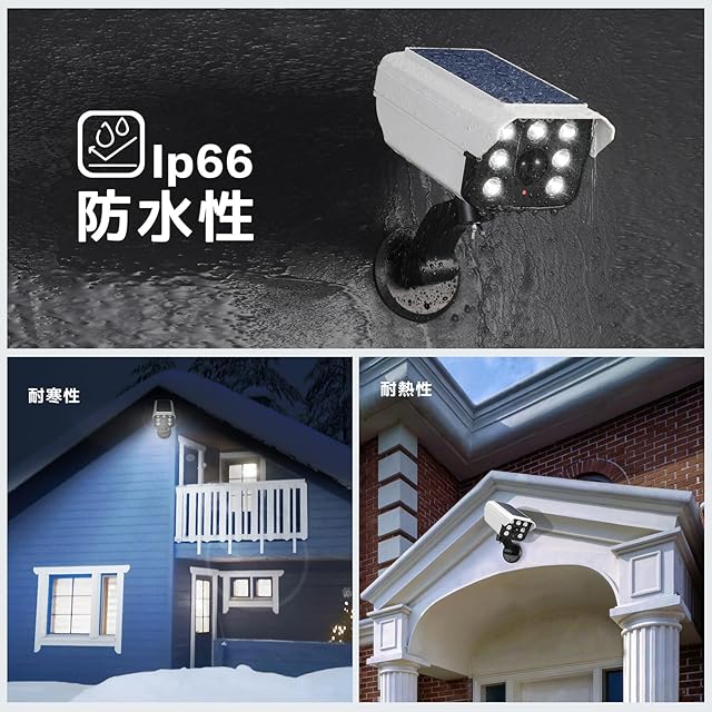 「防犯照明ライト」このソーラー人感センサーライト 玄関 はシミュレーションカメラ型の設計を採用している、防犯カメラと同じ外観を持つ、赤いLEDが常時点灯点滅します、動作していないときも赤くランプが光るので、夜間も警戒感が高くなります。玄関のドアや窓、車両、壁などの目立つ場所に取り付けることで、不審者や犯罪者を脅し、防犯効果をさらに高めることができます。(♥ご注意:必ず昼間長時間、直射日光が当たる、日当たりの良い場所に設置してください。)