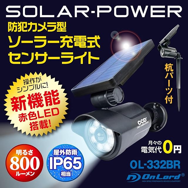 オンロード(OnLord) センサーライト 防犯カメラ型 ブラック 屋外防水 LED 人感センサー 太陽光発電 OL-332BR