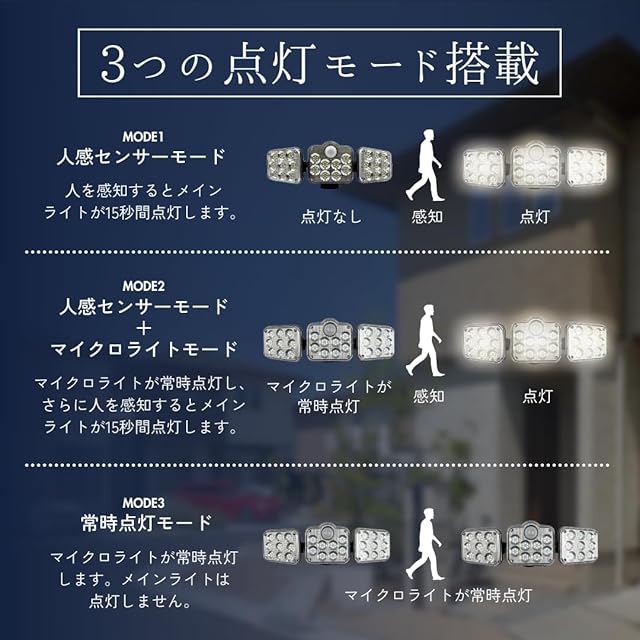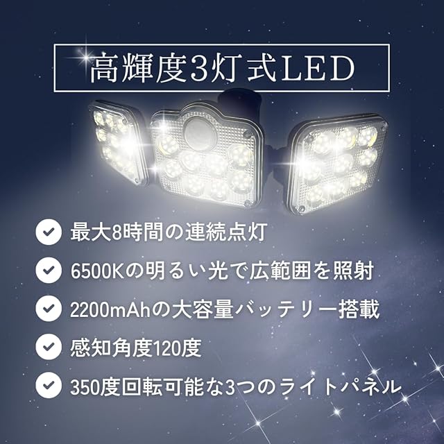 高照度 6500K LED:3灯式のとても明るいセンサーライトです