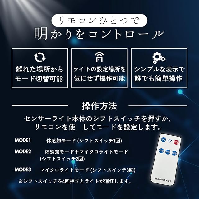 安心の国内ブランド「Longsafe」<br> <br> ◆高照度 6500K LED:3灯式のとても明るいセンサーライトです。<br> <br> 【分離型】<br> ソーラーパネルとライトを分離でき、屋外の日当たりが悪い場所でも使えます。<br> <br> 【室内も室外も 対応】<br> 防熱と防寒を兼ね揃えた屋外仕様で室内室外両方に対応しています。<br> <br> 【電気代ゼロ】<br> ソーラーパネルを搭載し、昼間は太陽の光を受けて内蔵された蓄電池に充電し、日没後は蓄電池を利用してLEDが点灯するため電気代はゼロ!<br> 満充電状態で6〜8時間点灯可能なので、停電対策・地震や台風などの万が一の災害時にも大活躍!<br> <br> 【光&PIR人感センサー】<br> 人感センサーは120度を感知可能。ソーラーパネル部分は上下160度、左右180度に動くことができます。<br> <br> 【IP65防水】<br> 高い防水性能により屋外でも安心してお使いいただけます。<br> <br> 【3つの点灯モード】<br> (1)人体感知モード:人感センサーが検知すると強い光で点灯しセンサーから離れると消灯します<br> (2)人体感知+マイクロライトモード:弱光で常時点灯し、センサーで感知すると強い光で点灯します。離れると弱光になります。<br> (3)弱光モード:弱光で常時点灯します<br> 3モードはリモコンで切り替え可能です。<br> 自動的に電気のオンオフをしてくれるので「うっかり」を防ぐことができます。<br> <br> <br>