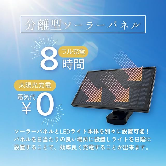 【分離型】ソーラーパネルとライトを分離でき、屋外の日当たりが悪い場所でも使えます